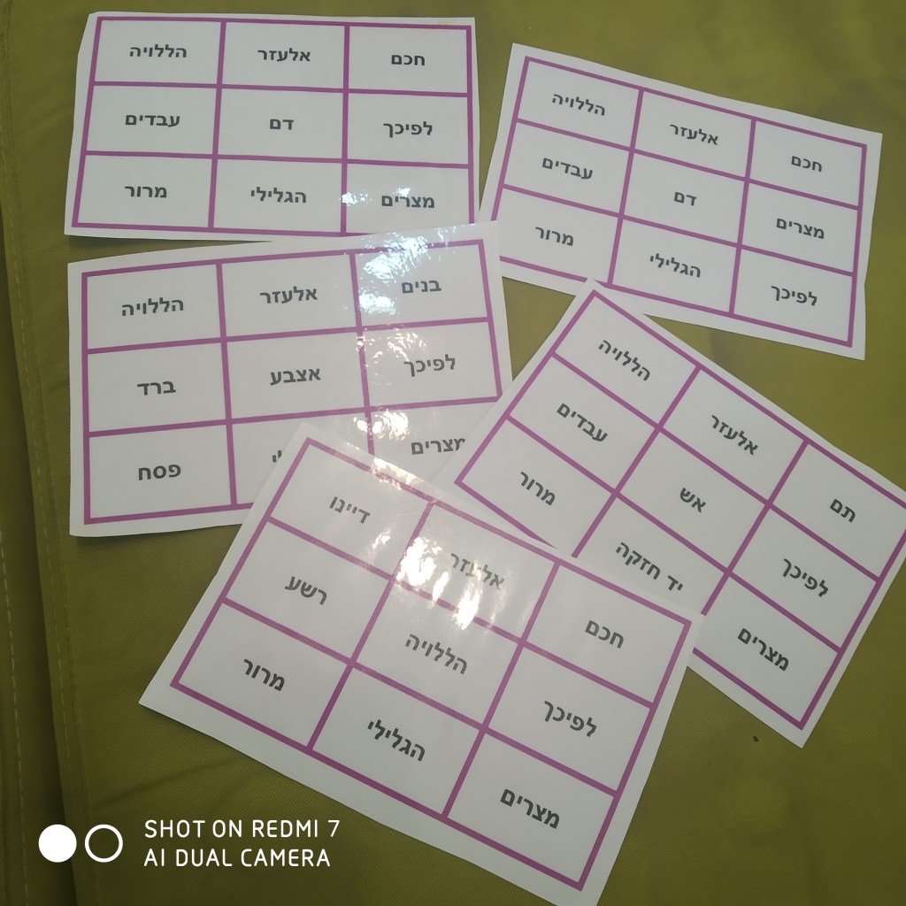 אתם יודעים לשחק בינגו? יופי! כל אחד מקבל לוח ומסמן בו (בגולה חצי שטוחה או חתיכת לגו, או כל דבר אחר שתסכימו עליו) כאשר מופיעה בהגדה המילה שכתובה לו באחת המשבצות.